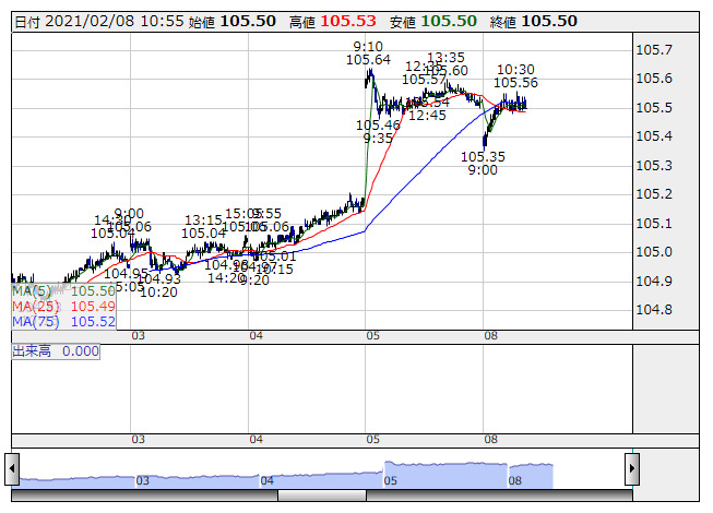 米ドル/円 <5分足> 「株探」多機能チャートより午前の東京外為市場でドル・円は1ドル=105円50銭近辺で推移。赤羽国交相は、Gotoトラベルについて、地域を限定して開始を望む声をもたくさん出ている、意見を聞きながら。来るべき時にはスムーズに再開できるようにしていきたい、と述べたとロイターが報じている。