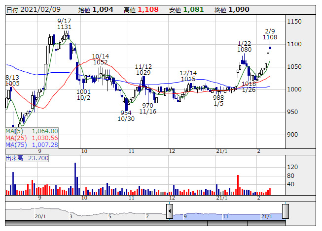 ユニマRC <9707> 1,390 +300 (+27.5%) 36,500 ( 5,073) 1,959,500 (272,370)