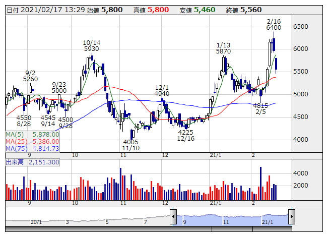 大幅に3日続落。目立った売り材料は出ていないが、メルカリ株は前日に上場来高値(6400円)を記録するなど短期間に急騰していることから、利益確定売りに押される展開が続いている。また、前日にバブル後最高値を更新した日経平均株価が17日は高値警戒感を背景に売り優勢で推移しており、株式市場全体に買い一服感が出ていることも新興株市場の主要銘柄とされるメルカリ株の売りにつながっているようだ。