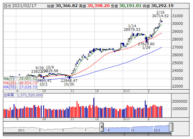 2021年02月18日08時46分 【市況】日経225先物:18日寄り付き=40円安、3万360円 日経平均 <日足> 「株探」多機能チャートより 18日8時45分、大阪取引所の日経225先物期近2021年3月限は前日清算値比40円安の3万360円で寄り付いた。前日の日経平均株価の現物終値3万292.19円に対しては67.81円高。夜間取引の終値3万420円に対しては60円安となっている。 株探ニュース