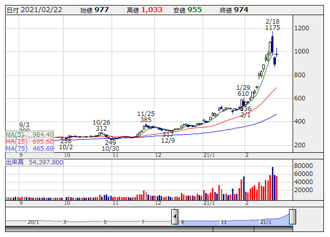 マネックスG <日足> 「株探」多機能チャートより(東証上場 4009 銘柄対象[ETF、REIT含む])