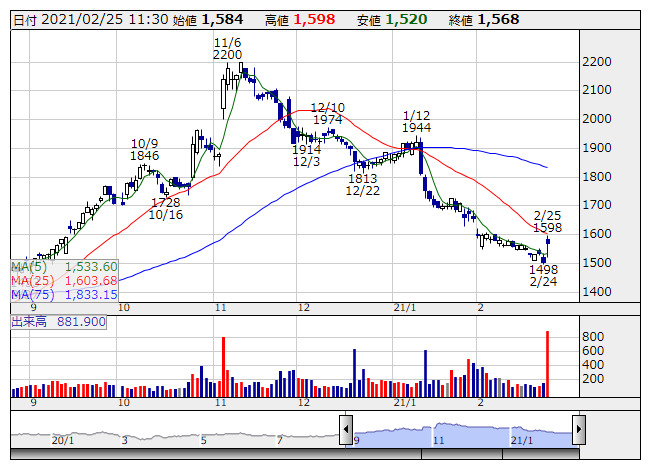 大幅反発。発行済み株式数の3.61%に当たる187.5万株、30億円を上限に自己株式を取得すると発表しており、目先の需給面での下支えが期待される形になっているようだ。取得期間は3月1日から9月15日まで。また、政策保有株の見直しに伴う保有株式の売却で、約50億円の売却益発生も発表。今期純利益は45億円から82億円に上方修正。一方、来年度からの株主優待廃止も発表しているが、マイナス影響は限定的にとどまる。