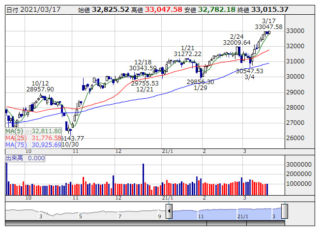 米国株式市場は上昇。ダウ平均は189.42ドル高の33015.37ドル、ナスダックは53.64ポイント高の13525.20で取引を終了した。長期金利の上昇を受けて、景気循環株を中心に買いが広がり、ダウは寄り付き後、上昇。注目となっていた連邦公開市場委員会(FOMC)で連邦準備制度理事会(FRB)は市場の予想通り政策金利の据え置きを決定したほか、2023年までゼロ金利を据え置く可能性を示唆したため早期の金融引き締めへの警戒感が後退し、上昇幅を拡大した。また、長期金利の上昇が一段落したため、ナスダック総合指数は下落から上昇に転じた。セクター別では、自動車・自動車部品が上昇した一方で、公益事業が下落。