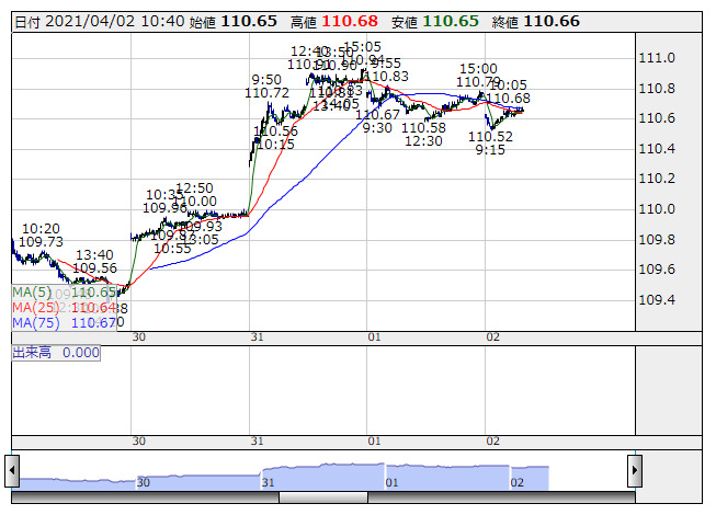 米ドル/円 <5分足> 「株探」多機能チャートより午前の東京外為市場でドル・円は1ドル=110円60銭近辺で推移。加藤官房長官は、菅首相が16日に日米首脳会談を行うと発表したもようだ。なお、これに先立ち、2日に米サリバン大統領補佐官が、日韓との高官協議で、バイデン大統領の北朝鮮政策の見直しに関して説明するもようとロイターが報じている。また、同補佐官は半導体不足に関しても言及するもよう。