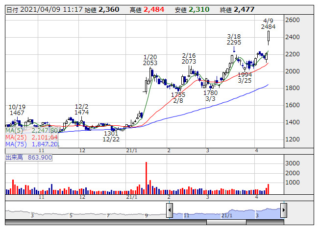 松田産業<7456>が急反発、一時5%を超える上昇で3月23日につけた年初来高値2185円をクリアした。電子部品スクラップから貴金属を回収する貴金属リサイクル事業を主力展開する。ここ金市況が底入れ反騰局面にあることで、同社の収益環境に追い風が意識される局面にある。同社の主要顧客であるエレクトロニクス業界は半導体産業を中心に生産活動が活発化しており、つれて貴金属リサイクルの取扱量も増加傾向をたどっている。21年3月期は営業利益段階で17%増益と2ケタ成長継続の見込み。株価はPERやPBRなど指標面からも割安で上値を見込んだ投資資金の攻勢に弾みがついてきた。