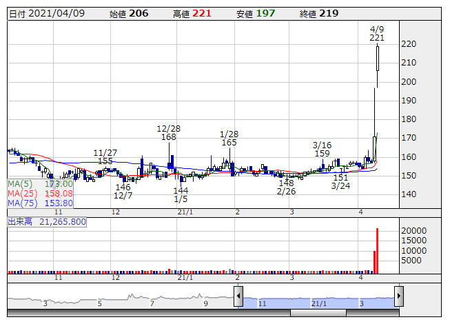 ウイルコHD <日足> 「株探」多機能チャートより●今週の株価上昇率ランキング【ベスト50】