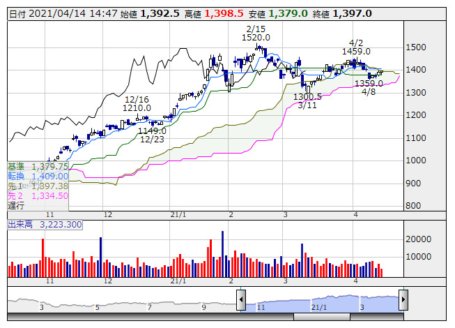 【テク】本日の【均衡表 《雲》|上抜け/下抜け】引け 上抜け= 91 銘柄 下抜け= 135 銘柄 (4月14日)