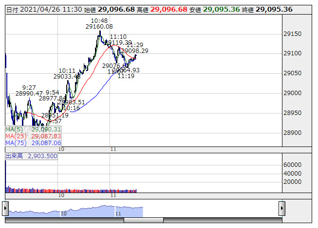 2021年04月26日12時32分 【市況】東京株式(後場寄り付き)=日経平均株価は前場終値比で一段高 日経平均 <1分足> 「株探」多機能チャートより 後場寄り付きの東京株式市場では、日経平均株価は前営業日比120円高前後と前場終値と比較して一段高。外国為替市場では1ドル=107円70銭台の推移。アジアの主要株式市場は高安まちまち。 出所:MINKABU PRESS