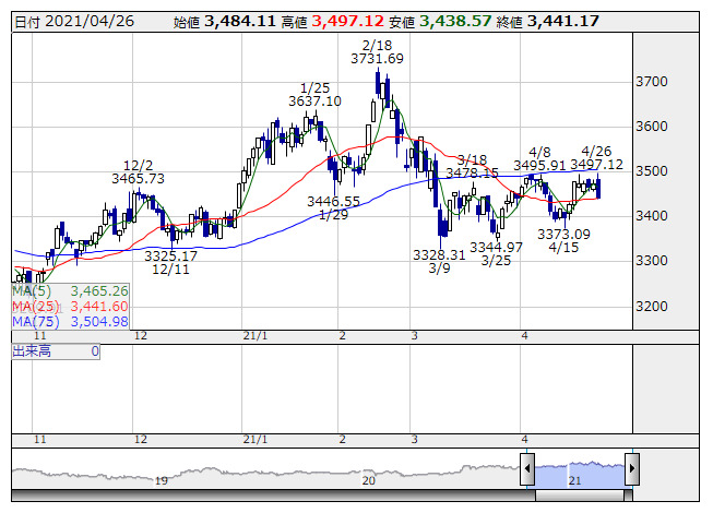 様子見ムードが漂う流れ。中国では今週30日に4月製造業PMIが公表されるほか、週末からメーデー連休(5月1?5日)がスタートする。中国の経済指標に関しては、このところ良好な内容が多いものの不透明感も浮上。朝方に公表された全国工業企業の利益総額は、今年3月に前年同月比で92.3%増加した。景気期待が高まる半面、経済正常化に伴う刺激策の縮小が不安視されている。(亜州リサーチ編集部)