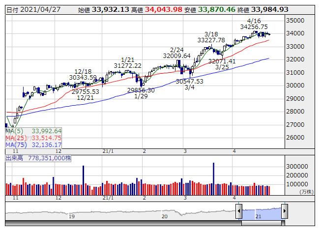 米国株式市場はまちまち。ダウ平均は3.36ドル高の33984.93ドル、ナスダックは48.56ポイント安の14090.21で取引を終了した。バイデン大統領が今週予定している議会演説でインフラ・社会保障に加え法人税、所得税などの税率引き上げの詳細が発表される見込みで、警戒感から寄り付き後、下落した。その後発表された4月の消費者信頼感指数がパンデミック以前の水準を回復したため、回復期待を受けた買いが再燃し、上昇に転じた。ただ、米連邦準備制度理事会(FRB)が開催している連邦公開市場委員会(FOMC)の結果公表を明日に控えて様子見気配も強く、ダウは小幅上昇にとどまった。セクター別では運輸やエネルギーが買われた一方、自動車・自動車部品が大きく売られた。