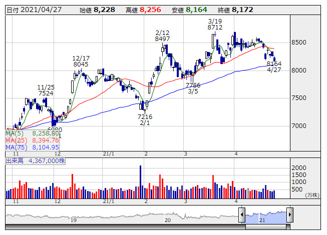 トヨタ <日足> 「株探」多機能チャートより28日前場の取引では以下の3つのポイントに注目したい。