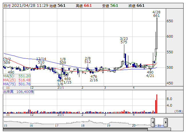 東京ボード <日足> 「株探」多機能チャートより28日前場 ストップ高: 1銘柄 ストップ安: 1銘柄 (気配、一時を含む)