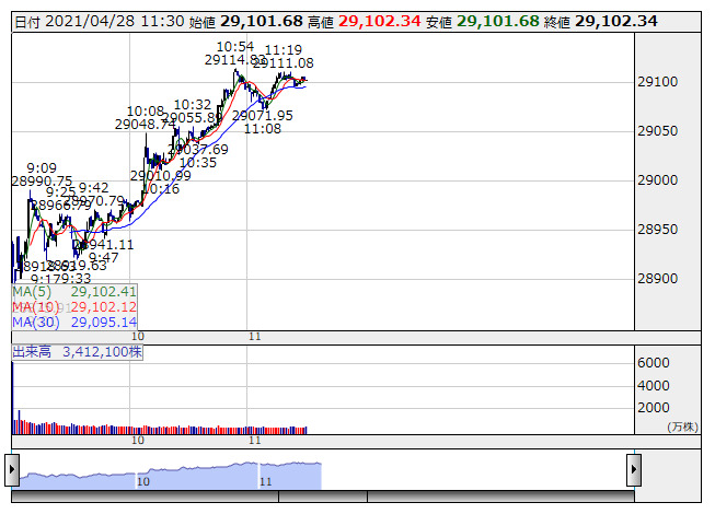日経平均 <1分足> 「株探」多機能チャートより日経平均 : 29102.34 (+110.45)