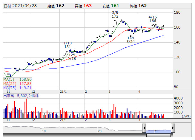 凸版 <7911> 1,949 +67 ( +3.6%) 43,700 ( 8,521) 40,600 ( 7,912)