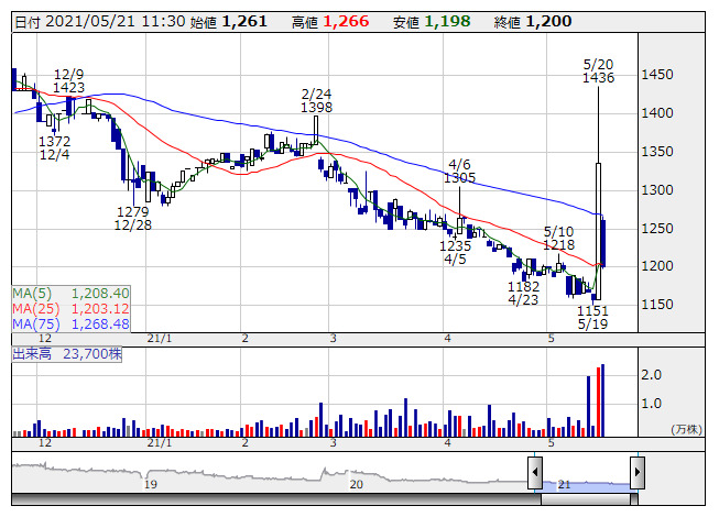 【材料】前場のランキング【値下がり率】 (5月21日)