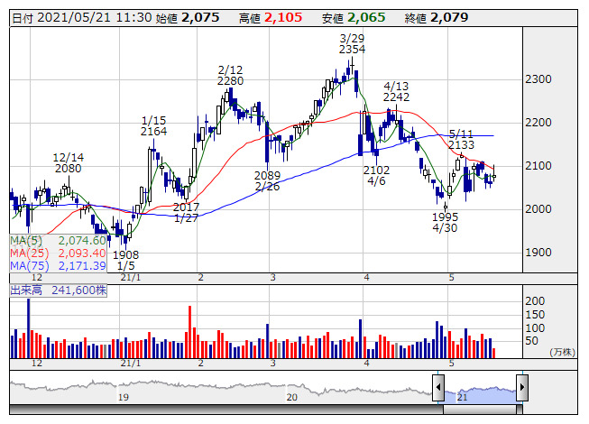 年初来高値。21年3月期の営業損益を前期比423.5%増の0.24億円の黒字と発表している。純損益は1.89億円の黒字(前期実績は0.38億円の赤字)となった。通信販売の需要が高まっていることに加え、販売用不動産を売却したことから利益が拡大した。持分法適用会社の投資利益が前期を上回ったことも黒字転換に寄与した。22年3月期の業績予想は非開示。