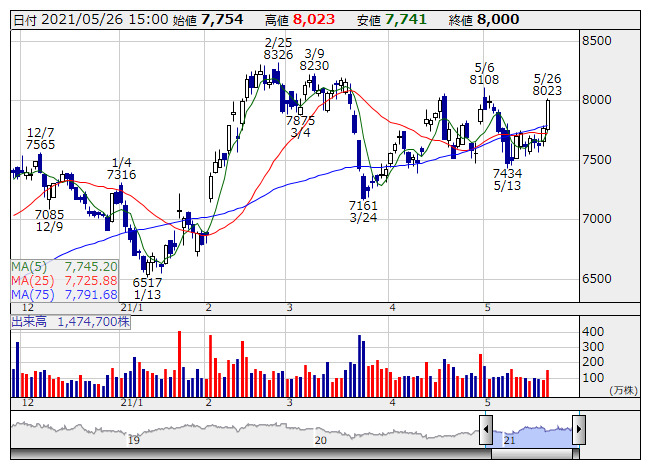 <4911> 資生堂 8000 +230 ( +3.0%) 7745.2 7725.9