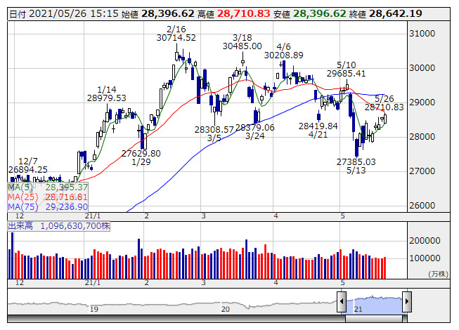 あすのスケジュールでは、国内では目立ったイベントはないが40年物国債の入札が行われる。海外では1~3月期の米GDP改定値が注目されるほか、4月の米耐久財受注額、4月の米仮契約住宅販売指数なども発表される。また、アジアでは1~4月の中国工業企業利益、韓国中銀の金融政策決定会合が予定されている。(銀)