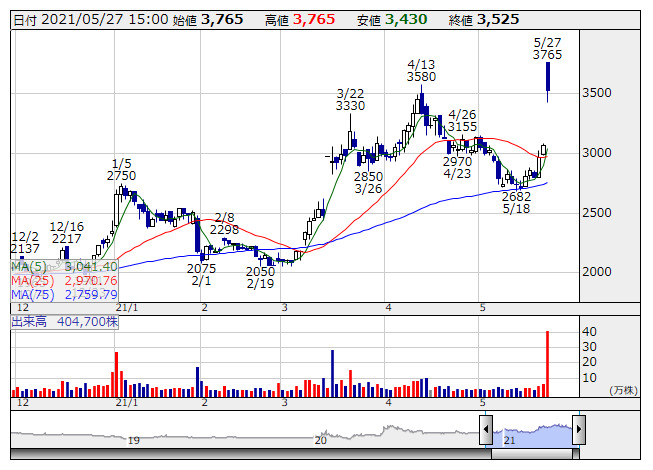 日本アビオ <日足> 「株探」多機能チャートより―決算で買われた銘柄! 上昇率ランキング―