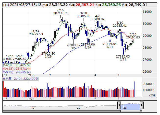 日経平均 <日足> 「株探」多機能チャートより日本取引所が公表した先物手口情報によると、5月27日の日経225先物期近(2021年6月限)の夜間取引(立会内・J-NETの合算)で、買い越しトップはJPモルガン証券の331枚、売り越しトップはBNPパリバ証券の293枚だった。