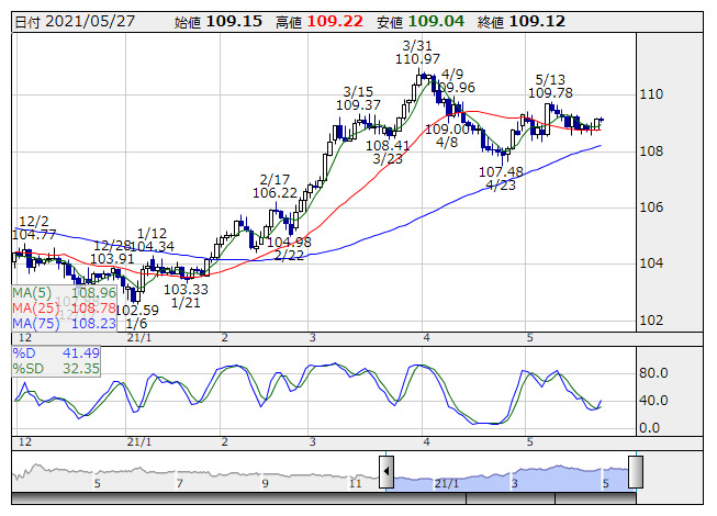 2021年05月27日18時01分 【通貨】外為:1ドル109円17銭前後と小幅なドル高・円安で推移 米ドル/円 <日足> Slowストキャス 「株探」多機能チャートより 27日の外国為替市場のドル円相場は午後6時時点で1ドル=109円17銭前後と、午後5時時点に比べ8銭の小幅なドル高・円安。ユーロ円は1ユーロ=132円96銭前後と17銭のユーロ安・円高で推移している。 株探ニュース
