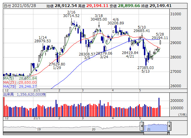 日経平均 <日足> 「株探」多機能チャートより今週の新興市場では、日経平均と同様にマザーズ指数、日経ジャスダック平均も上昇した。週半ばあたりまでは米長期金利の安定推移などからグロース(成長)株のリバーサル(株価の反転上昇)が続き、5月半ばにかけての調整がきつかった新興株にも買いが入った。ただ、マザーズ指数は1100pt台半ばに位置する25日移動平均線水準まで値を戻し、目先の利益を確保する売りも出た。また、週末にかけては株価指数イベント通過や米雇用改善を背景に大型・バリュー(割安)株優位となり、マザーズ指数は伸び悩んだ。なお、週間の騰落率は、日経平均が+2.9%であったのに対して、マザーズ指数は+1.5%、日経ジャスダック平均は+0.7%だった。