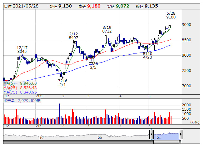 <6988> 日東電 39.35ドル 8645円 (-65円)