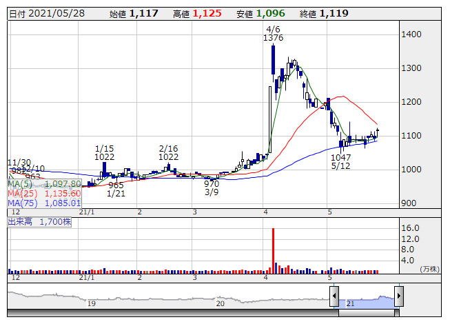 川口化 <4361> 1,419 +300 (+26.8%) 5,100 ( 723) 180,900 ( 25,669)
