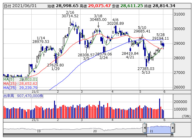 日経平均 <日足> 「株探」多機能チャートより[本日の想定レンジ]1日は米NYダウが45.86ドル高の34575.31、ナスダック総合指数が12.26pt安の13736.48、シカゴ日経225先物が大阪日中比15円安の28745。本日の日経平均は弱含みが予想される。昨日はローソク足が陰線を引く一方、株価下では25日線が上向きに転換して反転トレンド入りを窺わせた。ただ、一目均衡表では株価は雲下にあって売り手優位継続を示唆し、本日は遅行線の弱気シグナル発生再開が予想され、25日線(昨日大引け28652.62円)や昨日安値(28611.25円)付近での押し目買い需要を再度確認し、下値を固める展開が予想される。