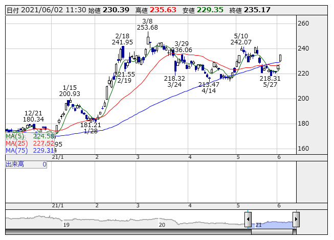 鉱業 <日足> 「株探」多機能チャートより●東証1部33業種 値上がり: 28 業種 値下がり: 5 業種