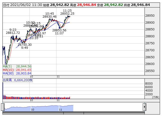 日経平均 <1分足> 「株探」多機能チャートより日経平均 : 28946.84 (+132.50)