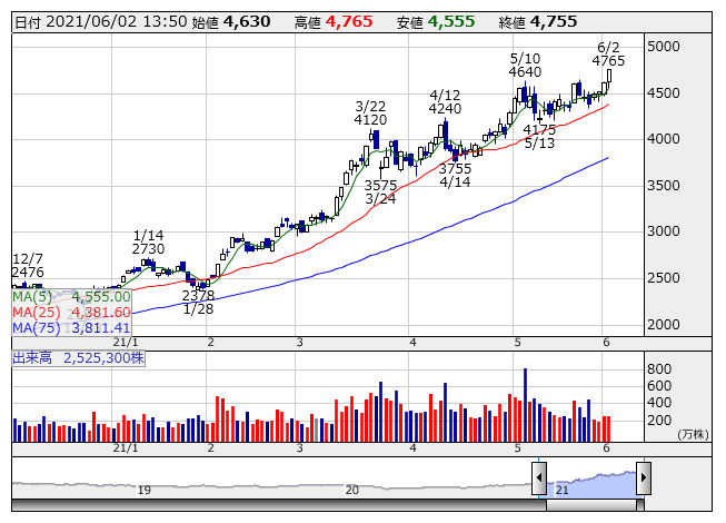 9104>も145円高の4645円まで上値を伸ばし、海運セクターは業種別騰落率でも値上がり上位に食い込んでいる。欧米では新型コロナワクチンの普及が進み、感染者数の減少が顕著となっている。経済活動の正常化期待から、グローバル物流を担う海運は収益環境に吹く追い風が意識されている。ここばら積み船市況の運賃動向を表すバルチック海運指数は水準を切り下げているものの、足もとでは発表された中国の5月の製造業PMIが好調で、物流需要が活性化するとの思惑が海運株の上昇を後押ししている。