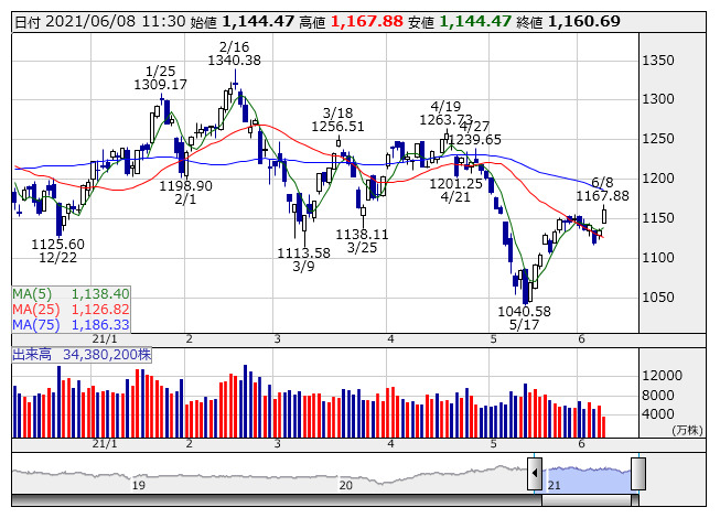 マザーズ指数 <日足> 「株探」多機能チャートより個別ではアジャイルメディア・ネットワーク<6573>がストップ高。ケアネット<2150>、ランディックス<2981>、マネーフォワード<3994>、Delta-Fly Pharma<4598>、I-ne<4933>など9銘柄は年初来高値を更新。日本リビング保証<7320>、モダリス<4883>、フリー<4478>、ステラファーマ<4888>、クックビズ<6558>は値上がり率上位に買われた。