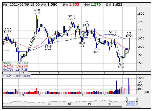 <3197> すかいらーく 1652 +81 ( +5.2%) 1594.6 1589.7