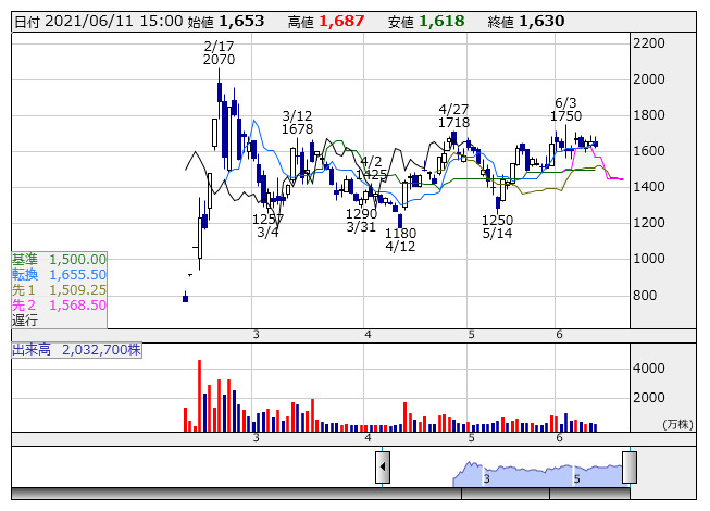 QDレーザ <日足> 一目均衡表 「株探」多機能チャートより●一目均衡表【3役好転】銘柄(市場人気順) ★強い上昇トレンドに入った可能性が高い銘柄