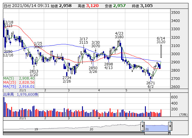 2021年06月14日09時31分 【材料】神戸物産---大幅反発、通期業績予想は想定以上の上方修正に 神戸物産 <日足> 「株探」多機能チャートより 神戸物産<3038>は大幅反発。先週末に上半期決算を発表、営業利益は144億円で前年同期比16.1%増益、市場予想を10億円程度上振れている。月次で単体の営業利益は開示しているが、子会社群の寄与などにより、想定以上の上振れに。通期では従来の248億円から294億円、前期比23.3%増にまで上方修正。市場予想は270億円程度であったとみられる。高い前年ハードルの中での大幅増益見通しをポジティブ視する動きが優勢に。 《TY》 提供:フィスコ
