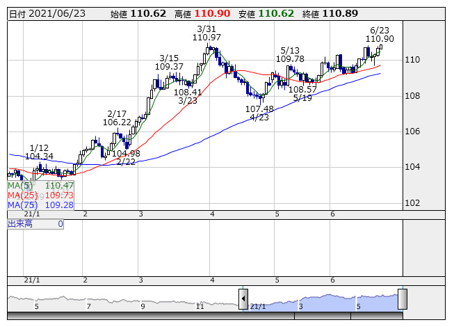 米ドル/円 <日足> 「株探」多機能チャートより米財務省は610億ドル規模の5年債入札を実施した。結果で最高落札利回りは0.904%だった。テイルは0.2ベーシスポイント。応札倍率は2.36倍と過去6回入札平均に一致。外国中銀を含む間接ビッドは57.6%と過去6回入札平均の59.2%を下回った。