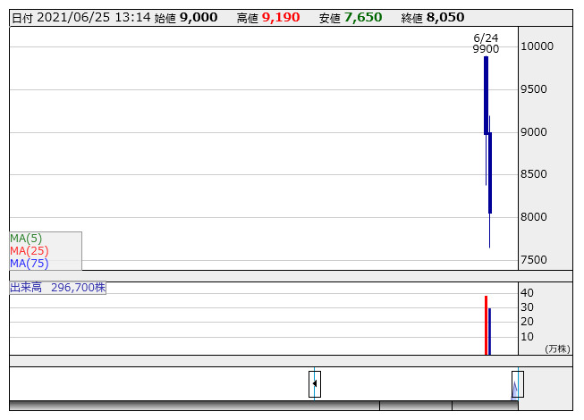 大幅安。目立った手掛かりが見当たらない中、利益確定売りが優勢となっている。同社は23日に上場したばかり。24日に公開価格(3120円)の3.2倍となる9880円で初値を付けた後、初値比910円安の8970円で取引を終えた。順調な初値形成を受けていったん利益を確保する動きが出たことに加え、来週以降も新規株式公開(IPO)が相次ぐことから、投資資金を調達する目的で直近の新規上場銘柄が売られているようだ。