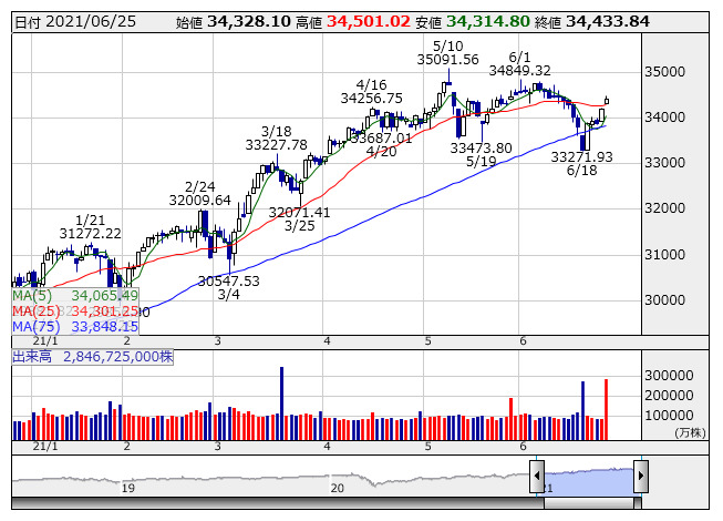 内外環境の改善で投資家心理が上向く流れ。バイデン米大統領は24日、上院の超党派グループとインフラ投資計画(総額5590億米ドル規模)で合意したと述べた。米株市場では、ハイテク株比率の大きいナスダック指数と機関投資家がベンチマークとして重要視するS&P500指数がそれぞれ史上最高値を更新している。内部的には、中国人民銀行(中央銀行)の資金供給継続がプラス材料となった。