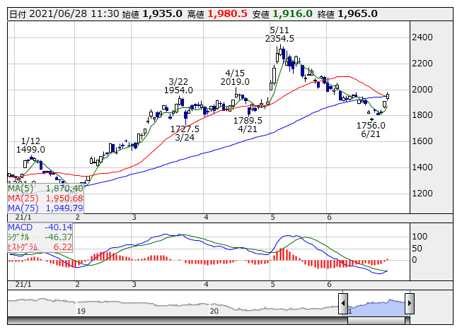 <5074> テスホールディングス 1815 +61 ( +3.5%) -21.9