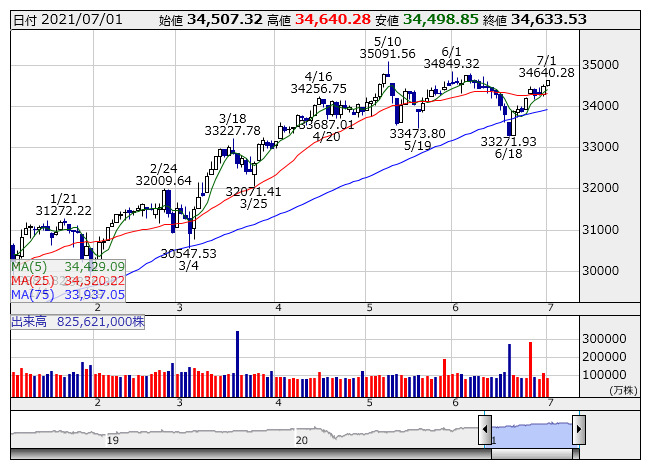 米国株式市場は上昇。ダウ平均は131.02ドル高の34633.53ドル、ナスダックは18.43ポイント高の14522.38で取引を終了した。週次の失業保険申請件数がパンデミックによる経済封鎖が始まった昨年3月中旬以降で最小となったため労働市場の回復期待が一段と強まり、寄り付き後、上昇。引き続き原油高も手伝い終日堅調に推移し、引けにかけて上げ幅を拡大した。セクター別では、エネルギーや耐久消費財・アパレルが上昇した一方で、食・生活必需品小売りが下落。