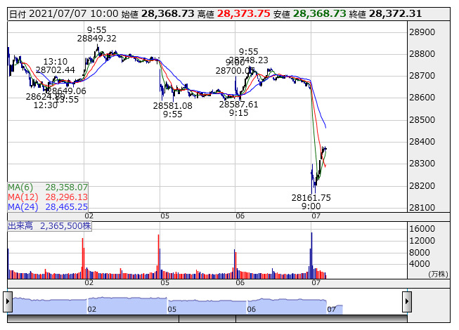 【市況】10時の日経平均は272円安の2万8371円、ファストリが33.85円押し下げ