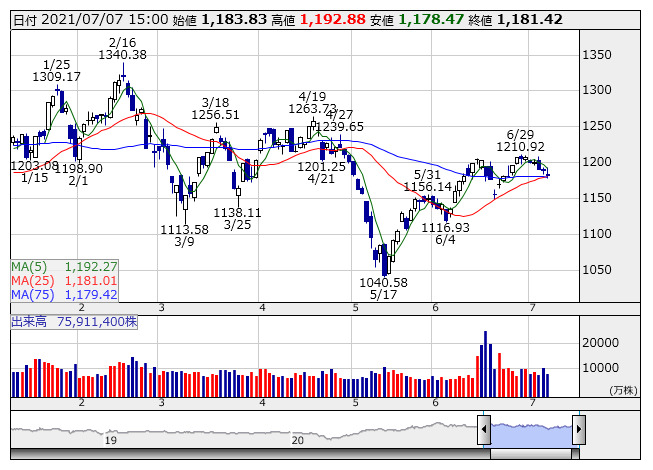 マザーズ指数 <日足> 「株探」多機能チャートより個別では総医研ホールディングス<2385>、ディジタルメディアプロフェッショナル<3652>、Aiming<3911>、ビーブレイクシステムズ<3986>、PKSHA Technology<3993>など26銘柄が年初来安値を更新。アドベンチャー<6030>、ティーケーピー<3479>、シリコンスタジオ<3907>、Sharing Innovations<4178>、アンジェス<4563>は値下がり率上位に売られた。