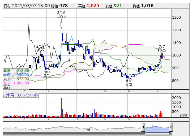 ユーグレナ <日足> 一目均衡表 「株探」多機能チャートより●一目均衡表の【雲】上抜け銘柄(市場人気順) ★2つの先行スパンに挟まれた上値抵抗帯を上抜けた銘柄