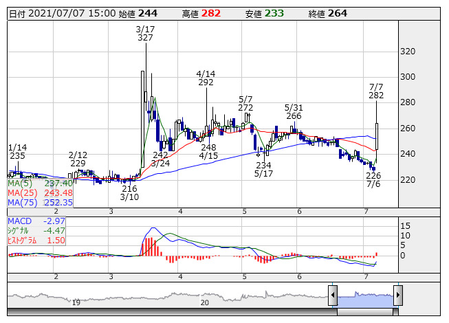 ケミプロ <日足> MACD 「株探」多機能チャートより●MACDが買いサイン銘柄(市場人気順) ★MACDがゼロ以下でシグナルを上抜いた銘柄