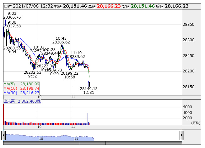 2021年07月08日12時31分 【市況】東京株式(後場寄り付き)=日経平均株価は前場終値比で下げ幅拡大 日経平均 <1分足> 「株探」多機能チャートより 後場寄り付きの東京株式市場では、日経平均株価は前営業日比200円安前後と前場終値と比較して下げ幅を広げている。外国為替市場では1ドル110円50銭台の推移。アジアの主要株式市場は総じて軟調。 出所:MINKABU PRESS