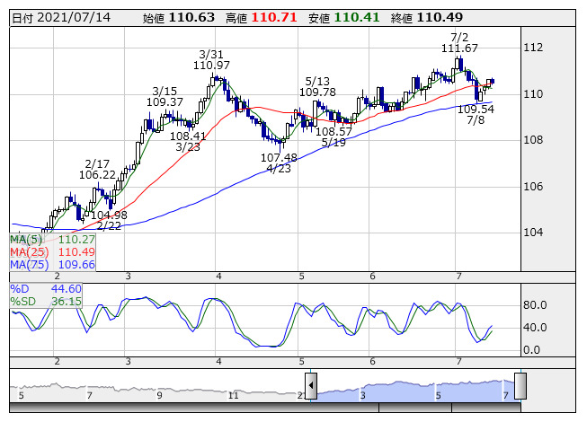 米ドル/円 <日足> Slowストキャス 「株探」多機能チャートより14日のニューヨーク外為市場でドル・円は、110円46銭から109円94銭まで下落し、109円95銭で引けた。消費者物価指数に続き米6月生産者物価指数(PPI)が予想を上回る上昇となったが、連邦準備制度理事会(FRB)のパウエル議長が下院金融サービス委員会での証言で、インフレ上昇は一時的で、経済が緩和縮小の条件を満たすのは程遠いとのハト派姿勢を維持したため、長期金利の低下に伴うドル売りが優勢となった。