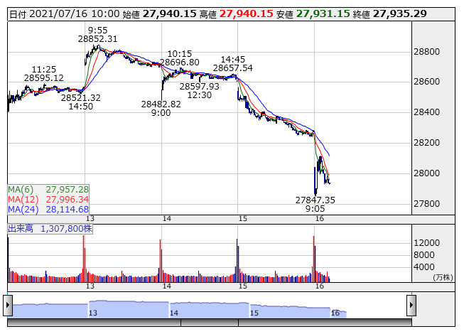 【市況】10時の日経平均は347円安の2万7931円、ファストリが105.51円押し下げ