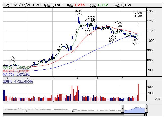 東レ<3402>が急伸。22日付の日本経済新聞朝刊で「2021年4~6月期は、本業のもうけを示す連結事業利益(国際会計基準)が前年同期の2.8倍の約350億円だったことがわかった」と報じられており、これが好材料視された。記事によると、航空機向け炭素繊維複合材料(CFRP)はなおも厳しいが、米中の経済回復で自動車や家電向け樹脂などが好調という。なお、決算発表は8月4日を予定している。