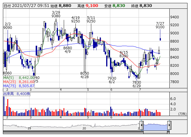2021年07月27日09時52分 【材料】トランコムは4日続伸、第1四半期営業益38%増で上半期計画進捗率59% トランコム <日足> 「株探」多機能チャートより トランコム<9058>が4日続伸している。同社は26日取引終了後に、22年3月期第1四半期(4~6月)の連結決算を発表。営業利益は前年同期比37.7%増の21億6400万円となり、上半期計画36億7000万円に対する進捗率は59.0%となった。 売上高は同10.2%増の396億500万円で着地。ロジスティクスマネジメント事業が既存拠点の物流増加や生産性の向上などから堅調に推移したほか、物流情報サービス事業が国内輸送需要の持ち直しなどを背景に伸長したことが寄与した。なお、上半期及び通期の業績予想は従来計画を据え置いている。 出所:MINKABU PRESS